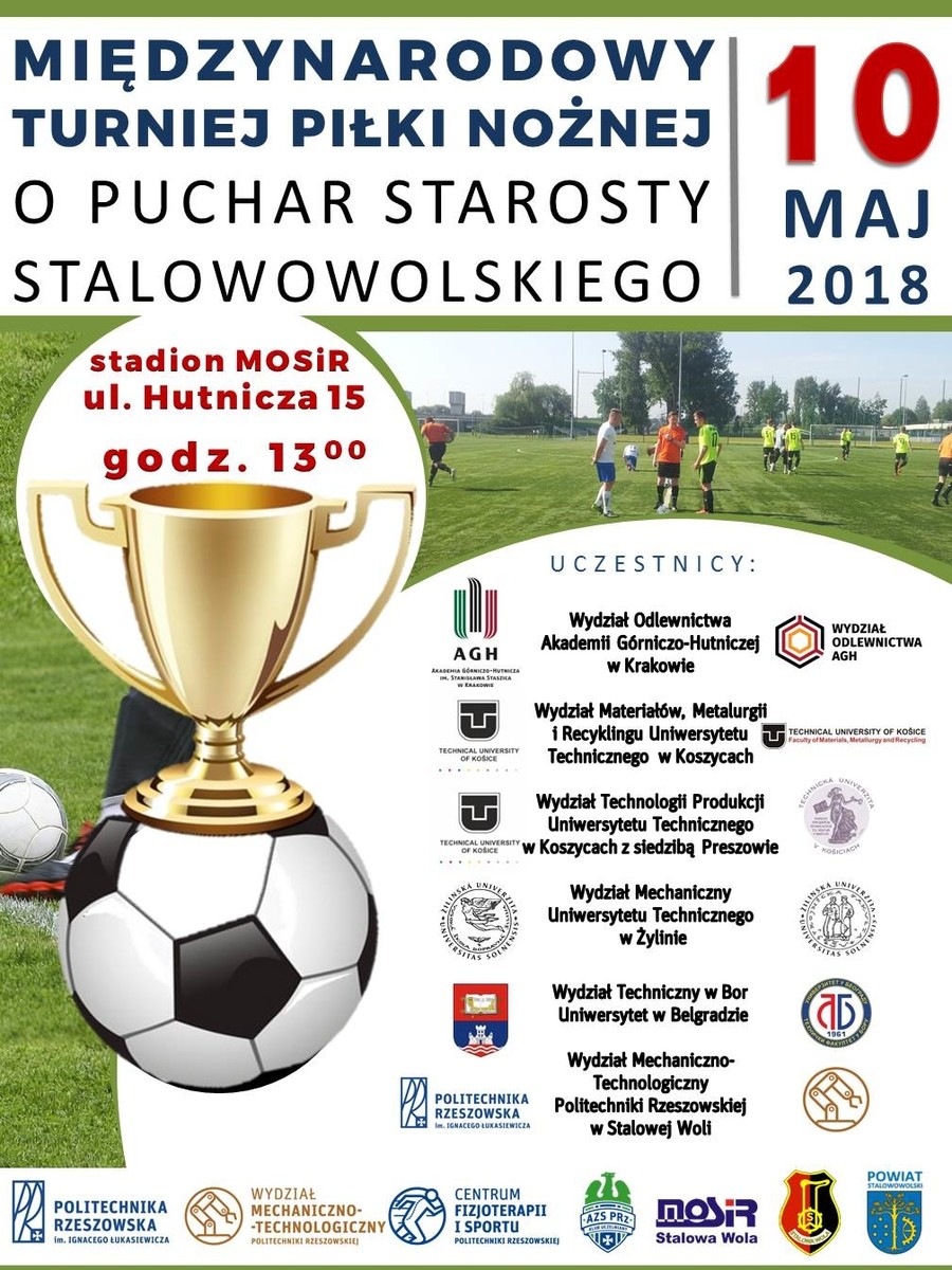 Wydział Mechaniczno-Technologiczny Politechniki Rzeszowskiej w Stalowej Woli organizuje Międzynarodowy Turniej Piłki Nożnej o Puchar Starosty Stalowowolskiego, który odbędzie się 10 maja na stadionie piłkarskim MOSiR w Stalowej Woli.