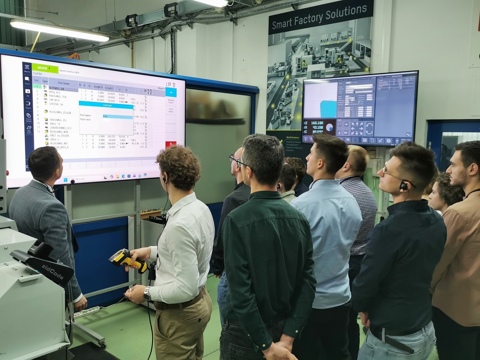 • pokazy automatycznego przesyłu danych narzędziowych bezpośrednio do obrabiarek CNC stanowiące integralny element zajęć demonstracyjnych i były realizowane z wykorzystaniem nowo wdrożonego w katedrze rozwiązania ZOLLER zidCode – przykłady przeprowadzono z zastosowaniem kodów QR, dedykowanego czytnika QR i systemu RunMyVirtualMachine, demonstrując praktyczne możliwości cyfrowej integracji systemów pomiarowych z procesami przygotowania i realizacji produkcji.