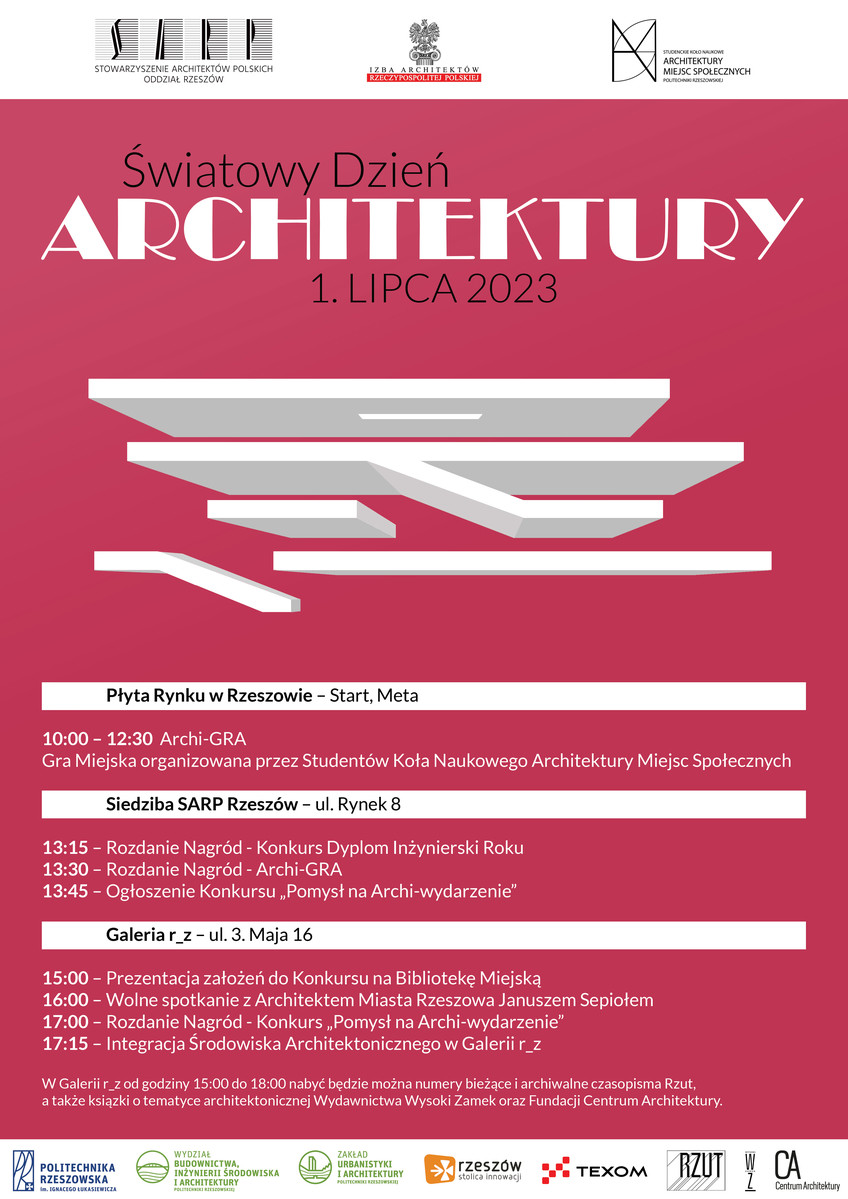 Już w sobotę 1 lipca 2023 r. na Rynku w Rzeszowie odbędzie się Światowy Dzień Architektury. Zapraszamy do udziału w wydarzeniu, które przybliży świat architektury i pozwoli spojrzeć na Rzeszów z zupełnie nowej perspektywy. Wydarzenie organizowane jest przez Koło Naukowe Architektury Miejsc Społecznych działające na Wydziale Budownictwa, Inżynierii Środowiska i Architektury Politechniki Rzeszowskiej wraz z SARP oddział Rzeszów i Podkarpacką Okręgową Izbę Architektów RP.